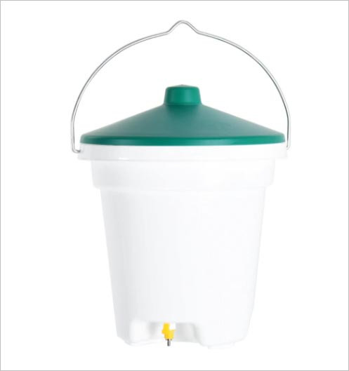 L'abreuvoir à seau est fourni sous forme d'ensemble complet avec trois embouts d'abreuvage, un couvercle et un support de suspension solide.