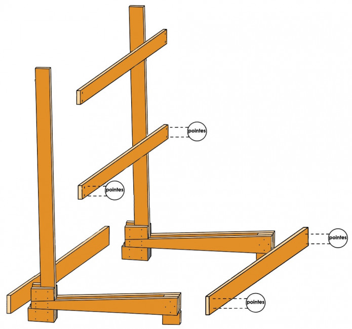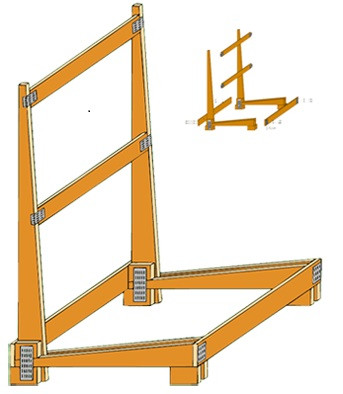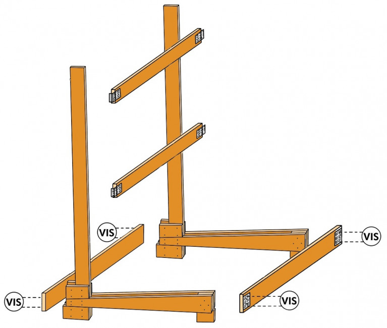 Le chevalet est composé d'une structure en bois massif avec des renforts métalliques et peut accueillir des traverses basses supplémentaires, réglables en hauteur, pour disposer d'appuis intermédiaires et sécuriser les charges.