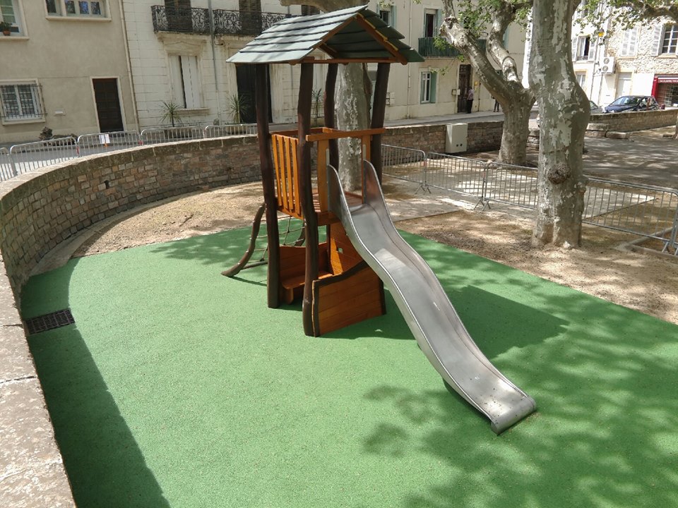 Une aire de jeux en bois assurent un espace convivial pour l’épanouissement des plus jeunes, leurs permettant de jouer individuellement ou en groupe et de développer leur motricité.