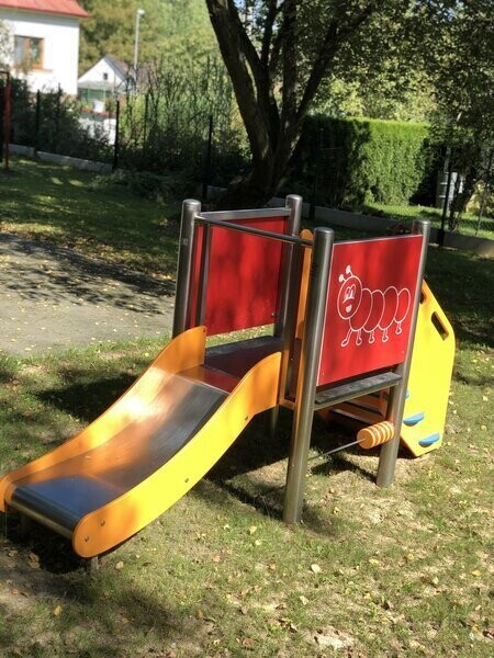 Cette aire de jeux extérieure est spécialement conçue pour les tout-petits, avec un toboggan et des jeux interactifs favorisant leur développement personnel.