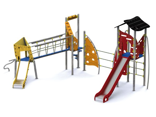 2 toboggans, d’un pont, de jeux d’escalade, d’une tour et d’un escalier.
