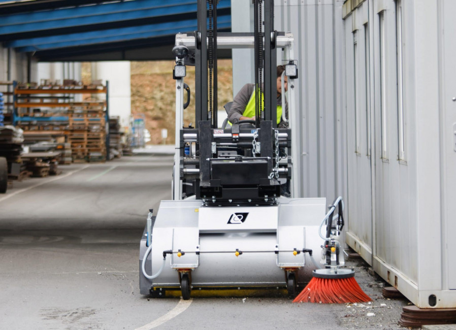 Cette balayeuse autonome pour chariot élévateur permet de balayer et de ramasser les déchets en un seul passage.