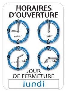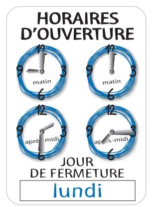 tableau affichage horaires 9h / 12h - 14h30 / 19h tous les jours sauf le samedi 9h / 12h15 -14h30 / 17h30 ferme le lundi
