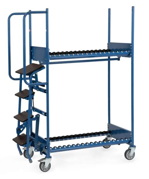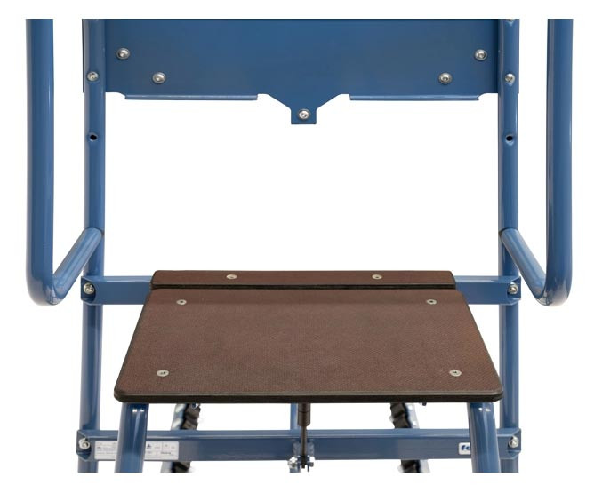 Le marchepied se soulève quand les marches sont libres et s'appuit sur le sol par le poids de l'utilisateur et bloque le chariot.