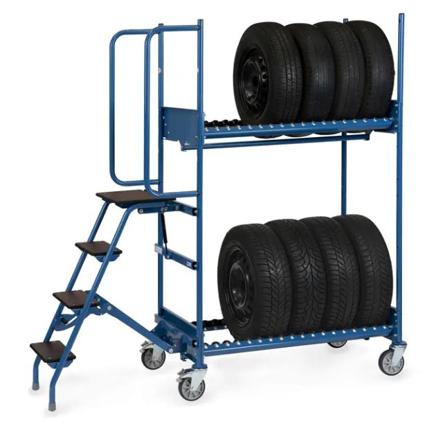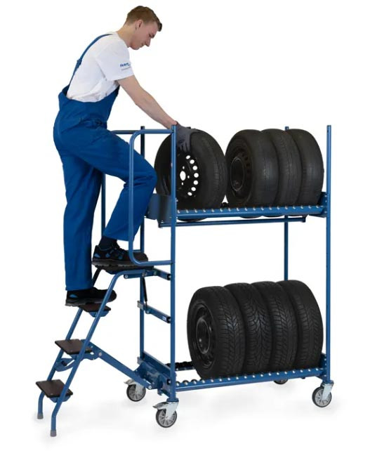 Ce chariot pour pneus est conçu pour une mise à disposition confortable de pneus et roues.