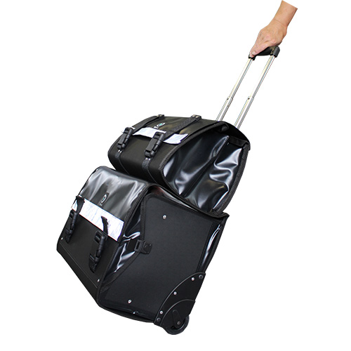 - La canne peut recevoir une 2ème sacoche qui se maintient par une sangle avec fermoir et repose sur la sacoche principale.