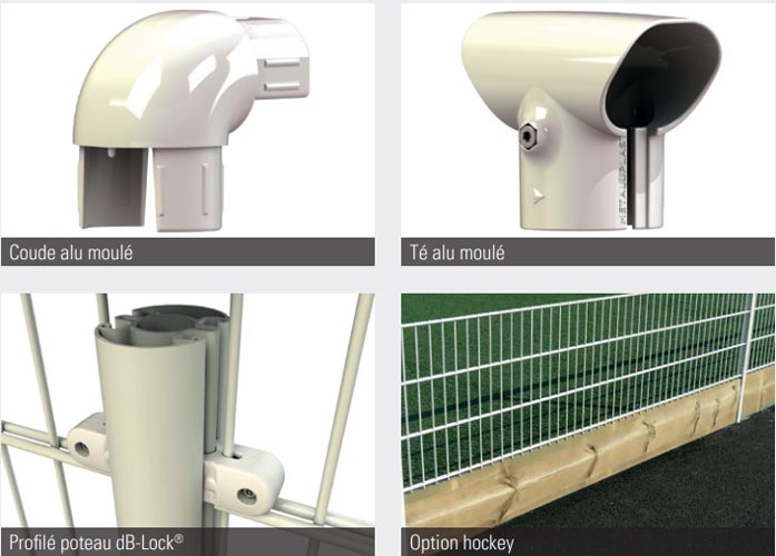 - Il permet de fixer une grille de 1 mètre de hauteur dans l’axe et de l’intégrer dans la lisse de la main-courante.