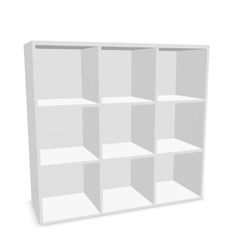 Armoire pour bureau composée de neuf cases et fabriquée à partir de panneaux de mélamine.