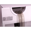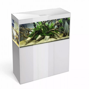 Le meuble qui accompagne l'aquarium est raffiné et solide, avec une finition laquée ultra-brillante et des portes acryliques qui brillent comme du verre.