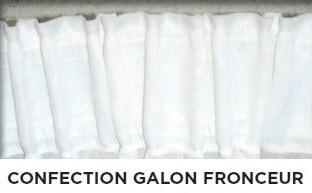 Galon fronceur : basée sur une ampleur minimale de 1.30 (par exemple, ampleur du rideau 130 cm pour une longueur de tringle de 100 cm). Ourlet bas et ourlets côtés. (sauf voilages ampleur 1.60)