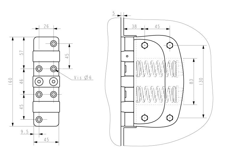 Ressorts, axe, goupille, ainsi que vis et écrous (partie mobile), fournis en inox