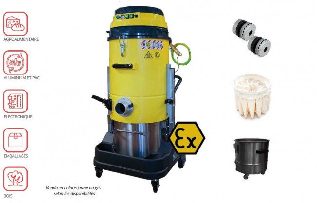 • Aspirateur mobile, doté de 2 moteur Brushless (pas de charbons) • Sécurité maximale y compris dans les zones à risque d'explosion • Certifié ATEX Z 22 / Ex II 3D Ex tc IIIB T°135 °C X Dc • Chambre de filtration avec filtre à poches en étoile en polyester d'une surface de 3 m² • Filtre antistatique classe M (1 micron) • Bac à poussière de 100 litres • Système de nettoyage du filtre par secouage manuel • Nettoyage et entretien simplifié • Remplacement facile du filtre • Chaine de mise à la terre • Construction acier avec une peinture époxy et une cuve en acier INOX AISI304 • Entrée poussières (Ø80 mm) • Dimensions : 770 x 660 x 1500 mm • Poids : 85 kg