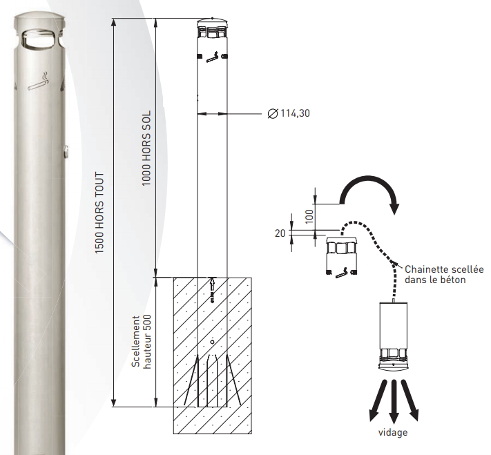 - Cendrier borne avec tête amovible par serrure, à sceller
