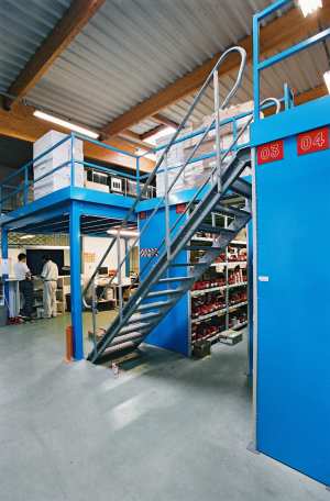 Des escaliers métalliques permettent l'accès aux étages, les parties face au vide sont équipées de rambardes de sécurité (conformes à la sécurité du travail).