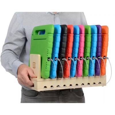 Pensée pour les écoles primaires et les établissements scolaires, elle permet une recharge centralisée de 10 tablettes, même lorsqu’elles sont équipées de coques de protection en mousse KidsCover®.