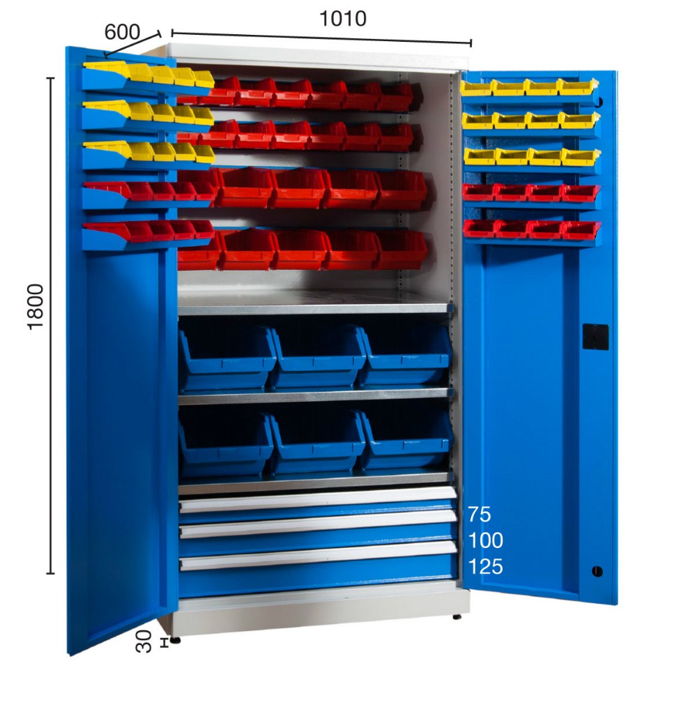 Rangez efficacement tous vos outils en optimisant l’espace de stockage grâce à cet armoire industrielle à bacs dotée de bacs à bec de différents formats.