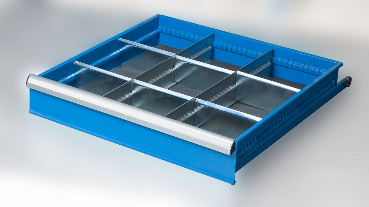 - 1 tiroir de 75 mm + 1 tiroir de 100 mm + 1 tiroir de 125 mm pouvant recevoir des séparations métalliques, des goulottes PVC ou des godets. Poignées recouvertes d'aluminium avec zone d'identification.
