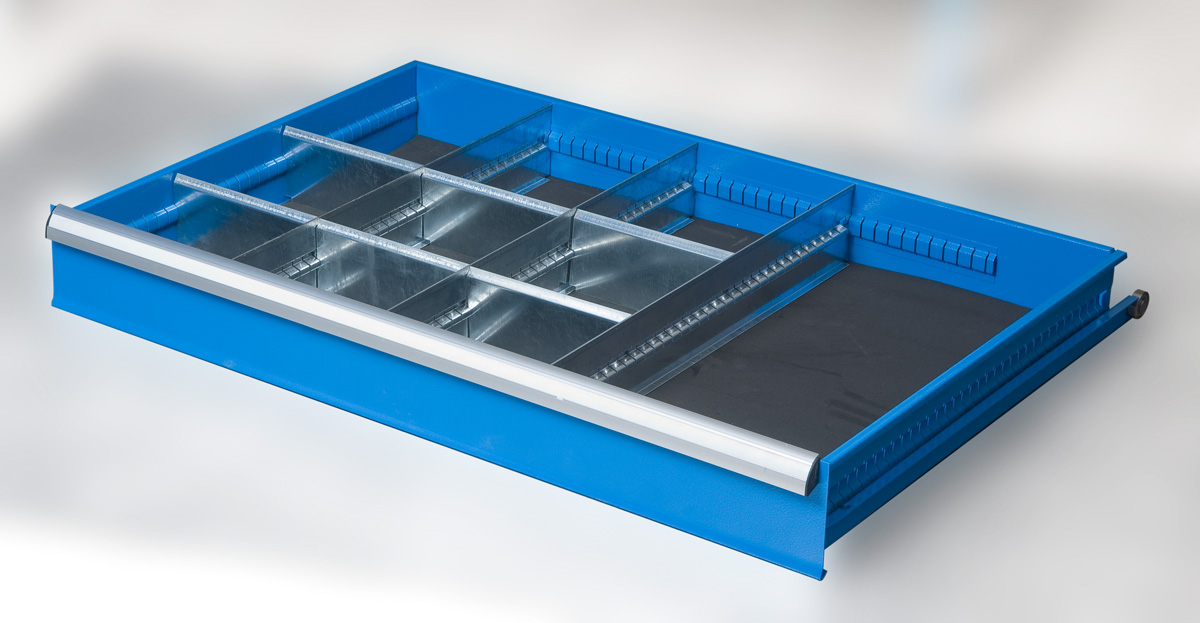 - Pouvant recevoir des séparations métalliques, des goulottes PVC ou des godets.
