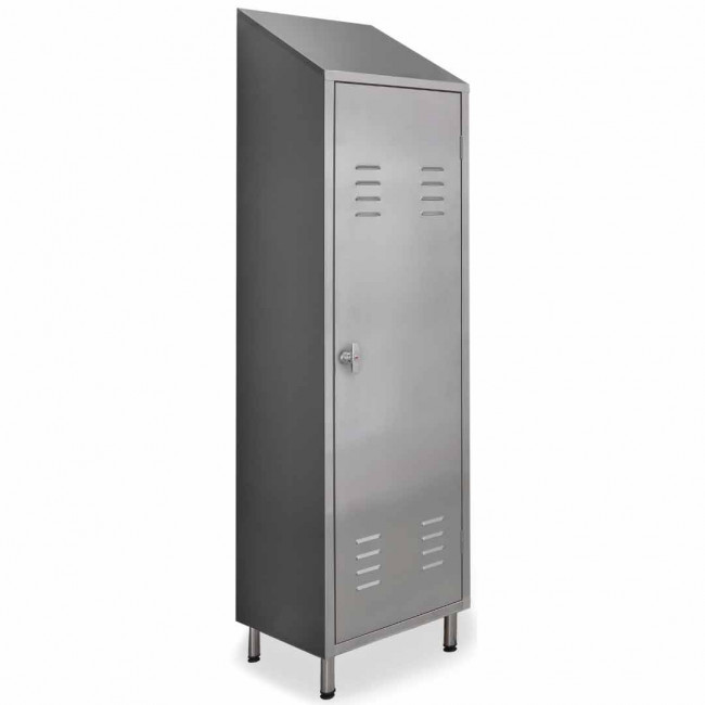 Son toit incliné anti-poussière évite l’accumulation de saletés, tandis que la porte battante à serrure garantit la sécurité du matériel.