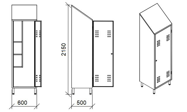 Avec ses dimensions de 600 × 500 × 1800 / 2150 mm, l’armoire offre une capacité suffisante pour stocker le matériel d’entretien sans encombrer l’espace.