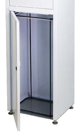 La porte inférieure se verrouille avec une fermeture à clé triangulaire, sécurisant le contenu et permettant un accès facile pour l'entretien sans compromettre la sécurité. |