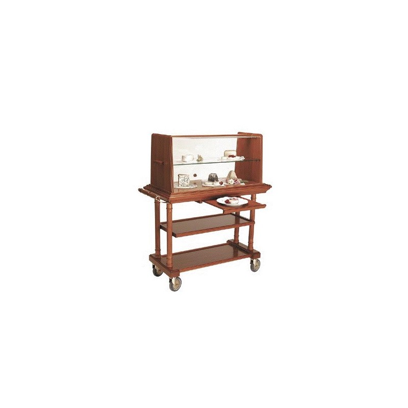 Ce chariot à fromages et pâtisseries en bois est conçu pour exposer et servir les gâteaux, du fromage et des apéritifs.