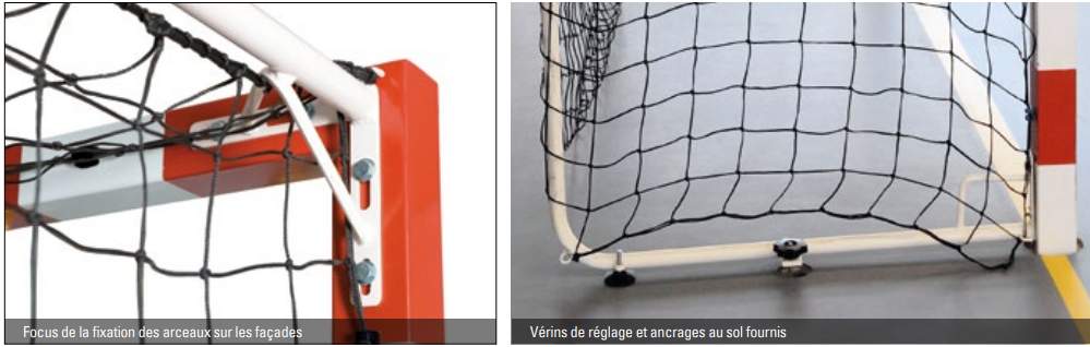 La barre de stabilisation à fixer au sol, les vérins de réglage et les ancrages fournis garantissent une stabilité optimale à chaque match.