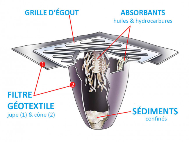 Le FILTRE B3.5 est un équipement anti-pollution adapté aux bouches d'égout. Il est conçu pour absorber les huiles, hydrocarbures et pour confiner les sédiments et autres matières en suspension contenus dans les eaux pluviales qui ruissellent jusqu'au réseau d'eau.