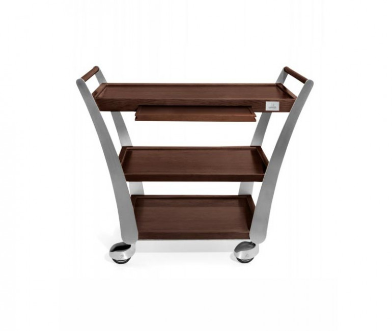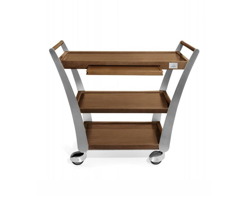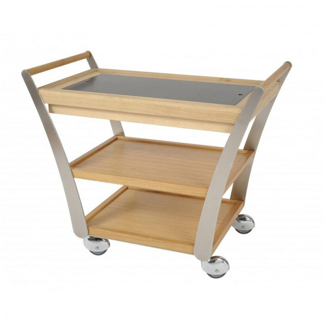 Ce guéridon de service professionnel combine l'élégance du placage chêne massif avec la robustesse de l'inox brossé pour offrir une solution de transport optimale dans votre établissement.