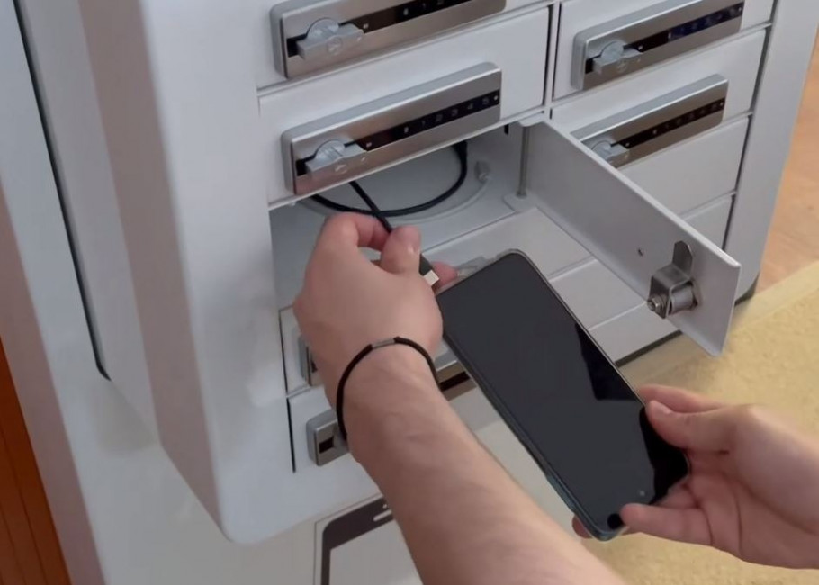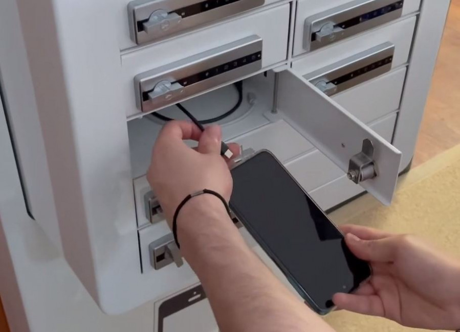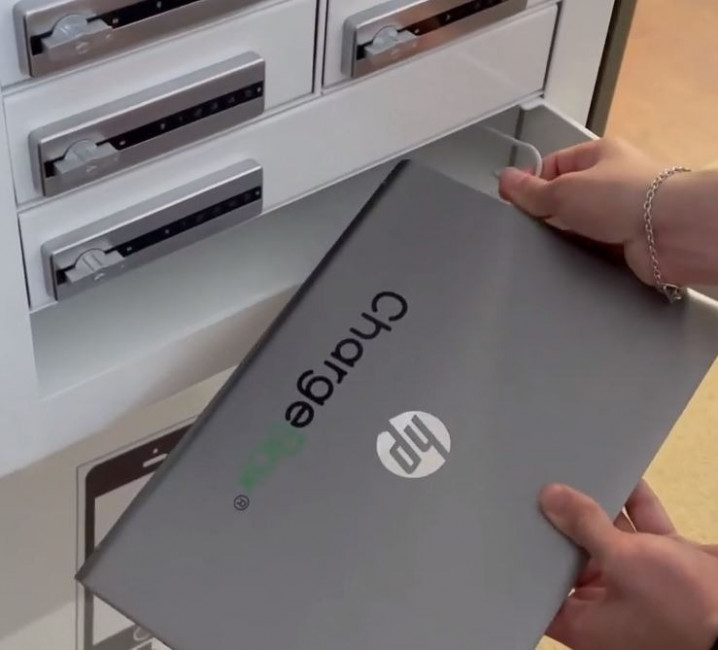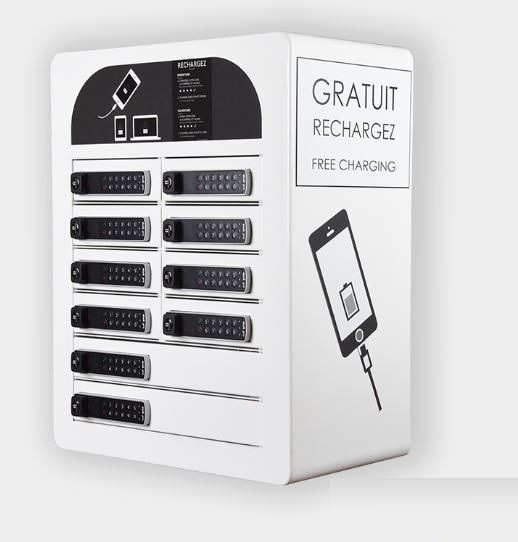 La borne offre 10 casiers individuels sécurisés pour 8 smartphones ou tablettes et 2 PC/MAC.