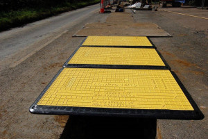 Cette passerelle de chantier en fibre de verre renforcée sert à garantir la circulation des personnes et des véhicules légers au-dessus d'un vide.