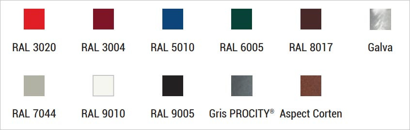 Il est disponible en finition galvanisée ou en version peinte sur galvanisation, offrant une bonne protection contre l’usure et les conditions extérieures.