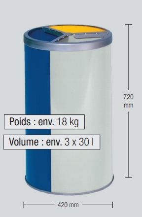 Capacité : 3 x 30 L Dimensions : (H x Ø) 720 x 420 mm Poids : 18 kg