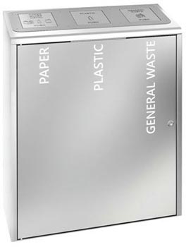 Cette borne est équipée de trois trappes distinctes avec signalétique claire pour différents types de déchets.