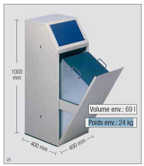 Volume env : 69L. Poids env.: 24 kg. Fabrication en tôle acier galvanisé. Collecteur fixe.