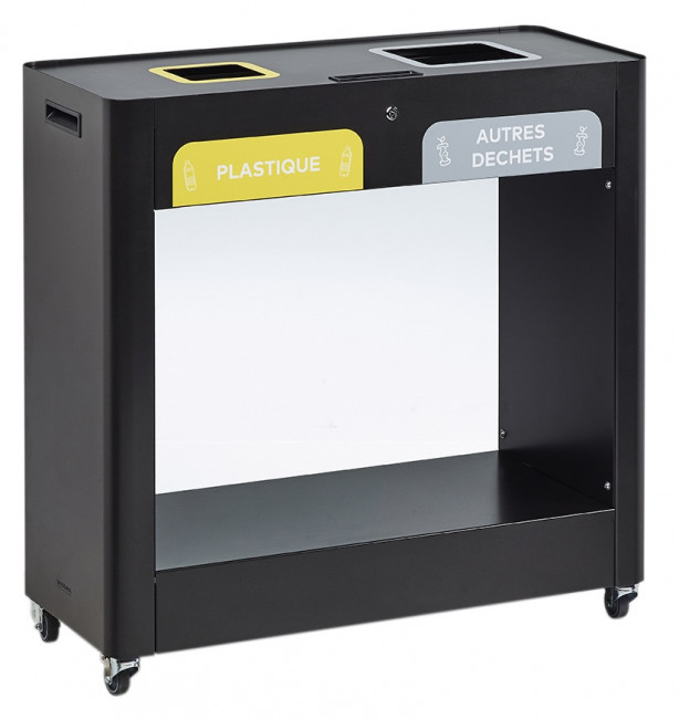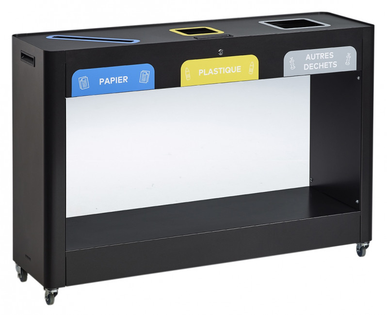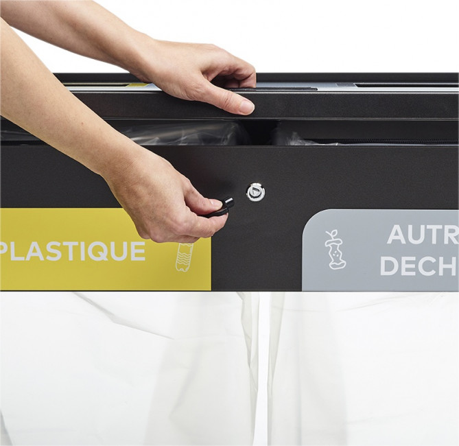 Disponible en deux configurations : 2x110L ou 3x110L, ce mobilier ergonomique s’aligne sur les exigences de sécurité Vigipirate et facilite le tri sélectif grâce à sa mobilité sur roulettes et à son système d’ouverture sécurisée.