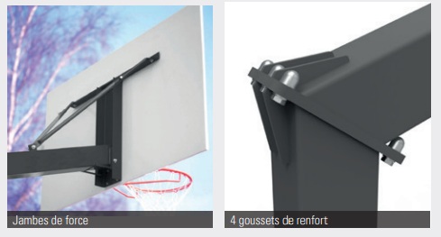 Vous bénéficiez d’un cercle renforcé avec filet Ø 5 mm, d’un réglage de verticalité du panneau, d’une hauteur de panneau ajustable et d’une structure optimisée pour la sécurité des joueurs.