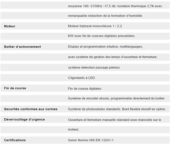 Elle est équipée de moteurs DIGIT à faible consommation électrique, de systèmes de sécurité conformes aux normes européennes, et peut être personnalisée pour s'adapter à diverses exigences d'installation.