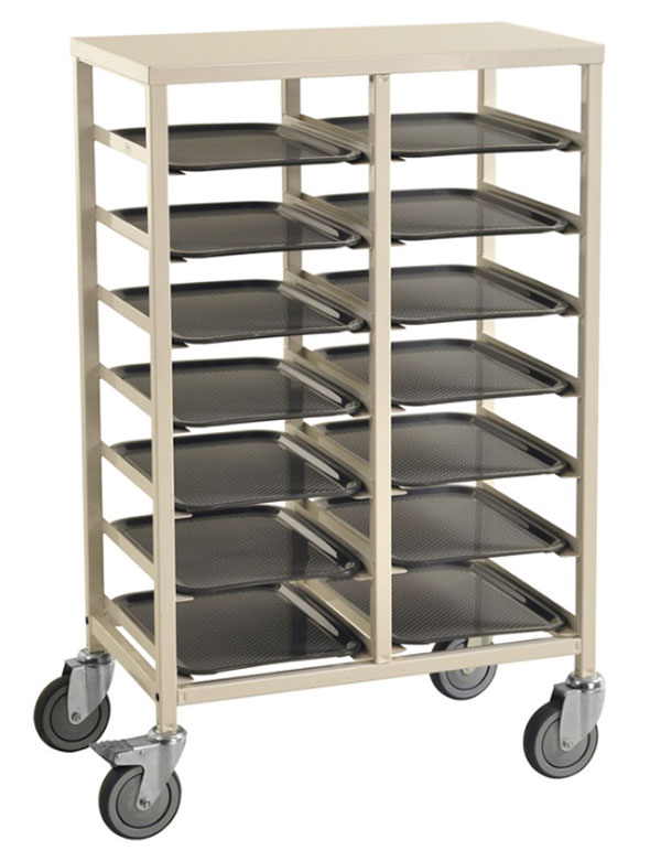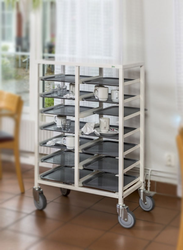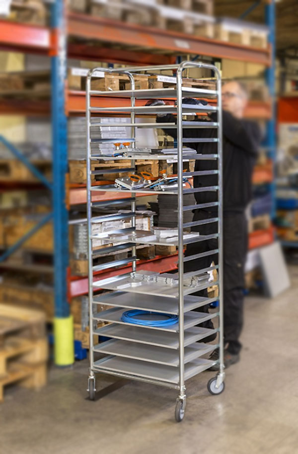 A revêtement thermolaqué ou électro-galvanisé, ce type de chariot peut recevoir jusqu’à 18 plateaux.