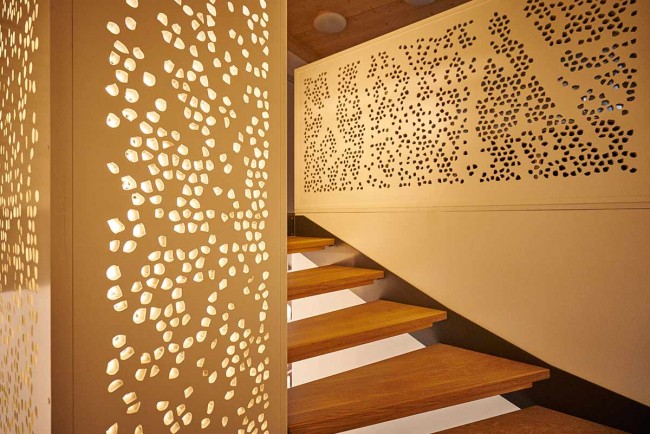 - Rampes d'escalier perforées activant les effets de lumière et d'ombre,