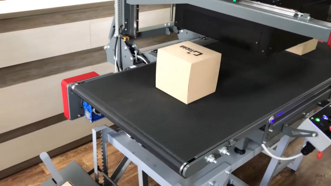3. Le système de positionnement avec mécanisme d'alimentation de matériaux d'impression (convoyeur) et panneau de commande.