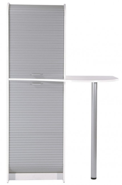 Meuble snack finition unique corps blanc et rideau argenté.