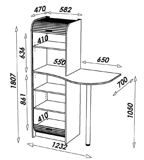 La tablette de 65 x 70 cm accueille la pause-café et peut être complétée par des tabourets de bar. Le meuble fait 1.81 m de haut, sa largeur totale (y compris guéridon) est de 123.2 cm et sa profondeur est de 70 cm.