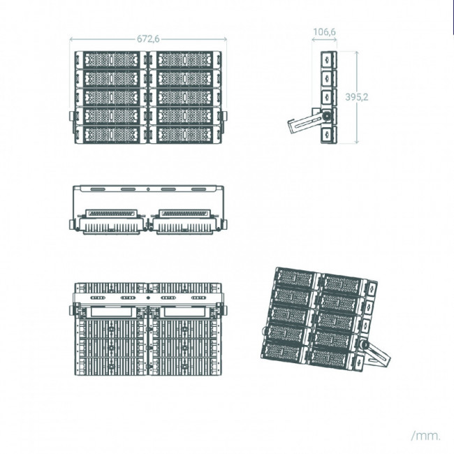 Le Projecteur LED Stadium Professionnel SAMSUNG 1000W 170lm/W IP66 INVENTRONICS Dimmable 1-10V est composé de 4 modules de 250W et grâce à sa fabrication modulaire, permet le changement de modules unitaires, sans avoir à remplacer tous les modules qui composent le produit.