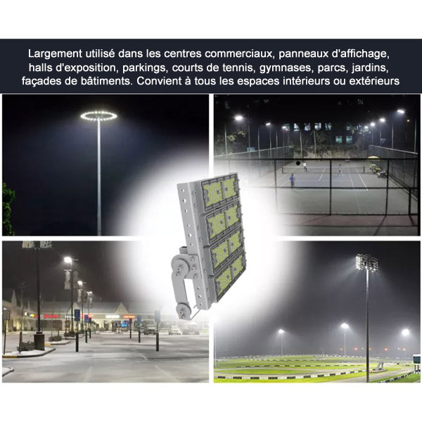 Ce modèle de projecteur est parfait pour éclairer les terrains de sports, parkings, jardins, parcs et places publics. Il convient aussi pour les espaces intérieurs nécessitant un éclairage haute luminosité tels que les locaux de stockages, gymnases, usines, centres commerciaux, magasins, etc. Les couleurs d’éclairage disponibles sont blanc chaud (3000k), blanc neutre (4500k) et blanc froid (5700k).