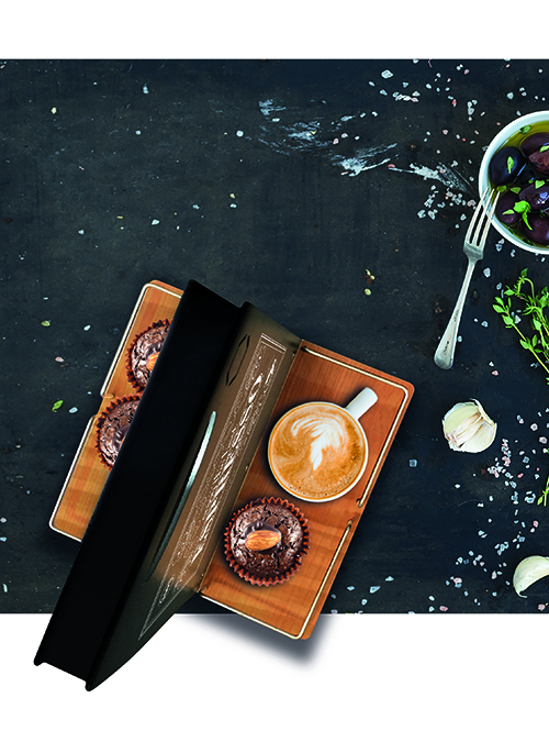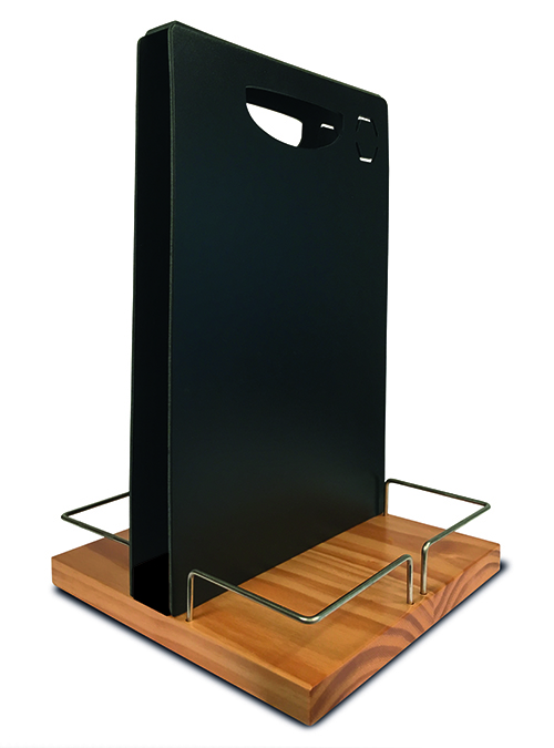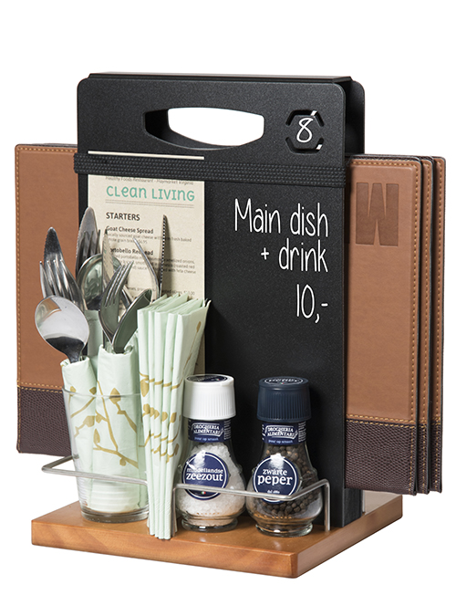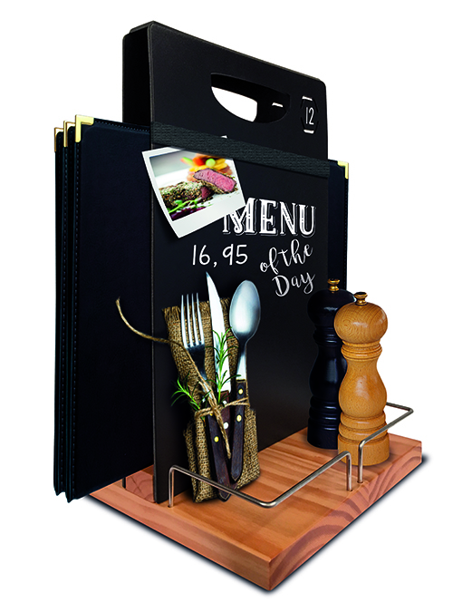 Ce chevalet de table est équipé d'un espace de rangement pour porte cartes-menu.