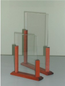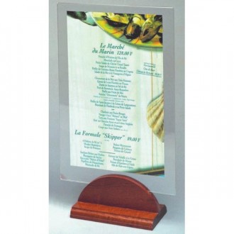 Composé d"un chevalet bois teinté vernis et d"un plexiglas 1.5mm plié à chaud, bonne stabilité grâce à son poids et à sa forme