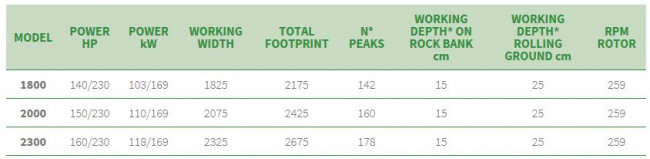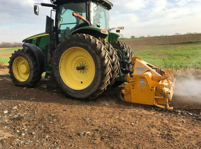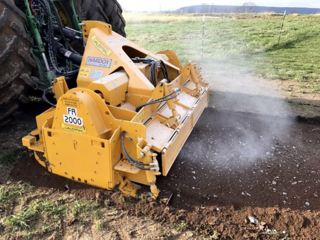 Le broyeur de pierres Valentini FR-RAMBO 2T permet de travailler dans le sol jusqu’à 25 cm, il se décline en différentes largeurs de travail de 1800 à 2300 mm. suivant la largeur de travail souhaitée, il faut un tracteur de 140 à 230 CV pour l’entrainer.