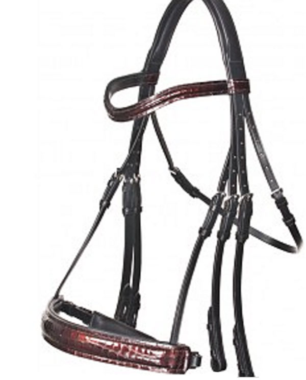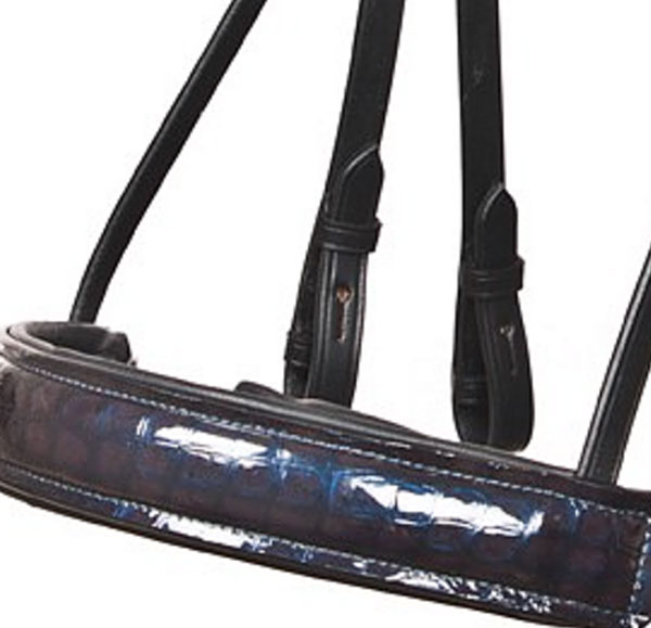 Ayant effet crocodile, cette bride offre confort grâce au rembourrage de la muserolle et de la têtière.