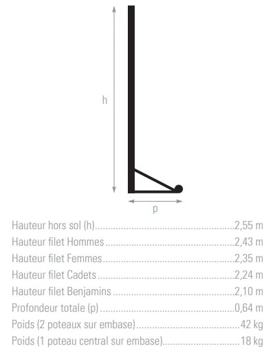 Leur embase à roulettes permet un déplacement fluide sans effort, tandis que la réglette coulissante et le mètre sérigraphié facilitent le réglage précis de la hauteur du filet selon le niveau de pratique : hommes, femmes, cadets ou benjamins.